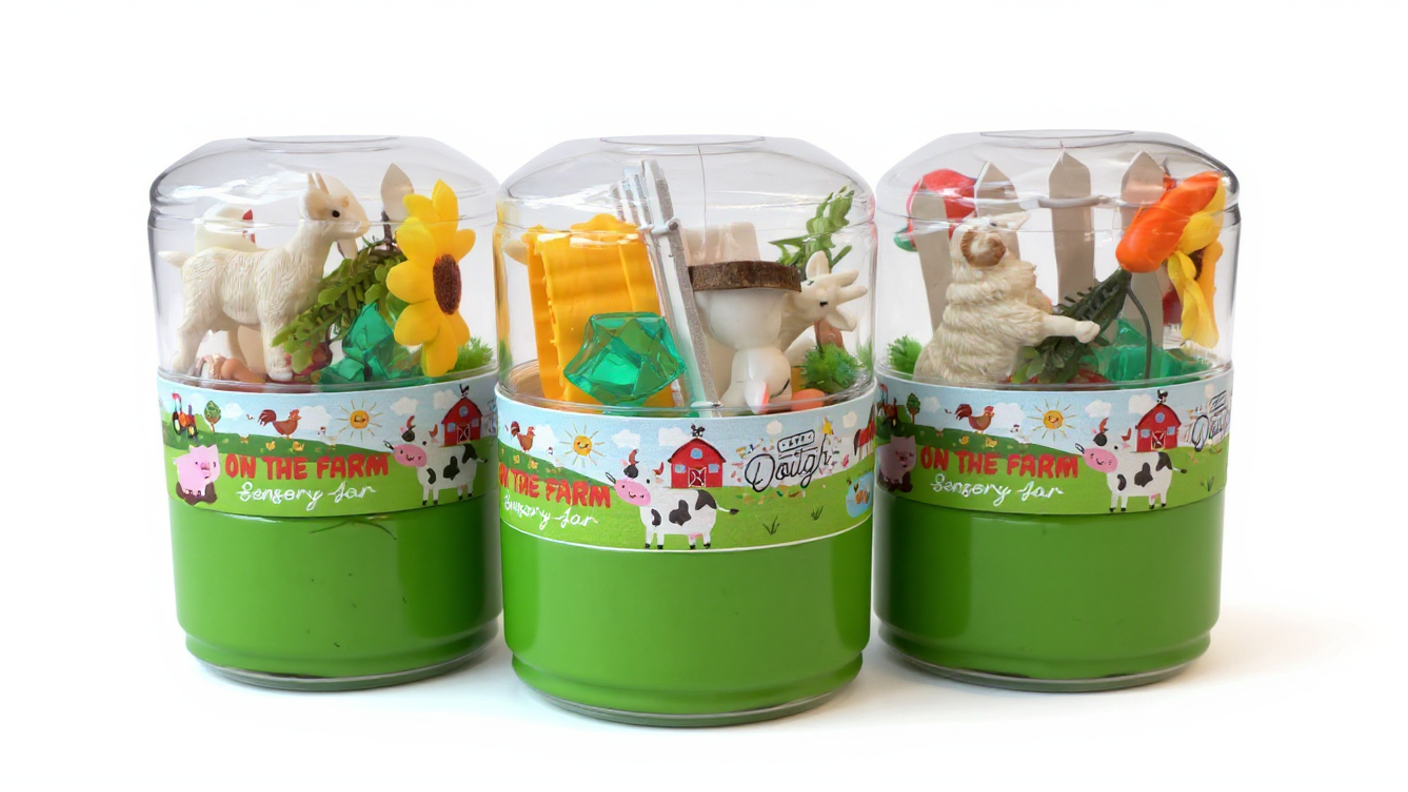 Bring the barnyard to life with the On the Farm Dough to Go Duo! This sensory kit invites little hands to create their own vibrant farm scene with soft, green dough and a variety of charming farm-themed treasures.
