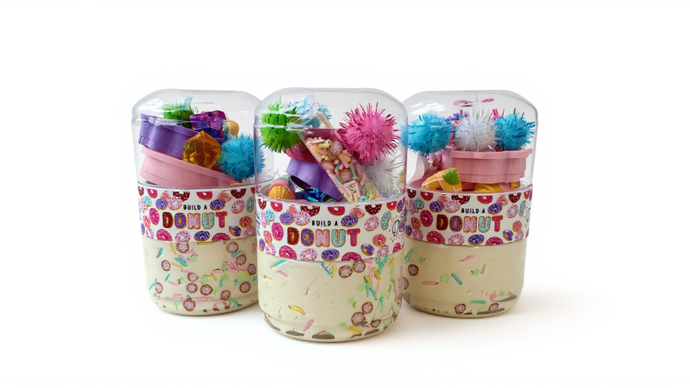 Packed in two reusable jars β one for dough, one for all the fixings β this set is perfect for creative play at home, on the go, or at your next donut-themed party!